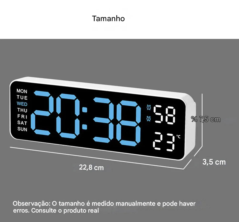 Transforme qualquer ambiente com um toque de tecnologia e modernidade. O relógio digital exibe em uma única tela a hora, data, temperatura e umidade, mantendo você sempre informado com apenas um olhar. Ideal para salas, escritórios, quartos ou ambientes comerciais, ele combina design minimalista com funcionalidades essenciais para o dia a dia.
